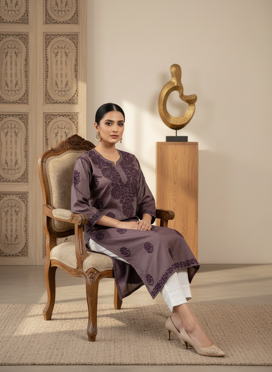 TISSUE COTTON PREMIUM HAND-EMBROIDERED CHIKANKARI KURTA -Brown