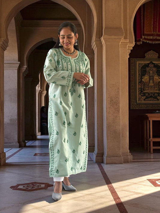 RAJASI PASTEL GREEN HAND-EMBROIDERED CHIKANKARI KURTA