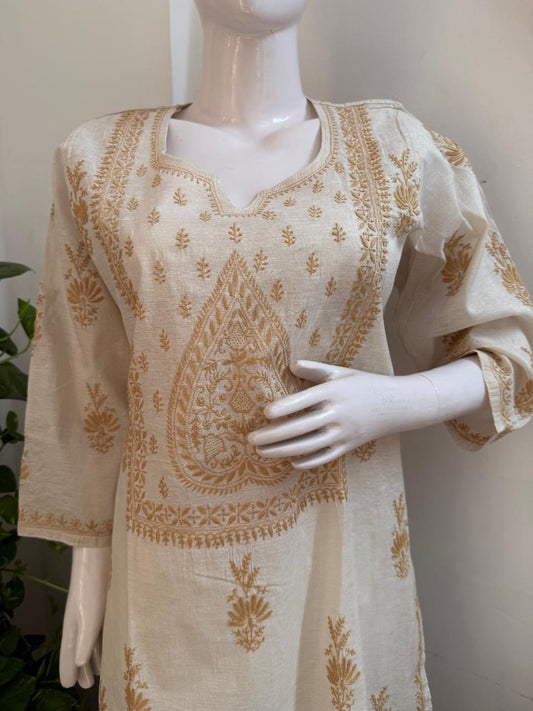 TISSUE COTTON PREMIUM HAND-EMBROIDERED CHIKANKARI KURTA- Golden