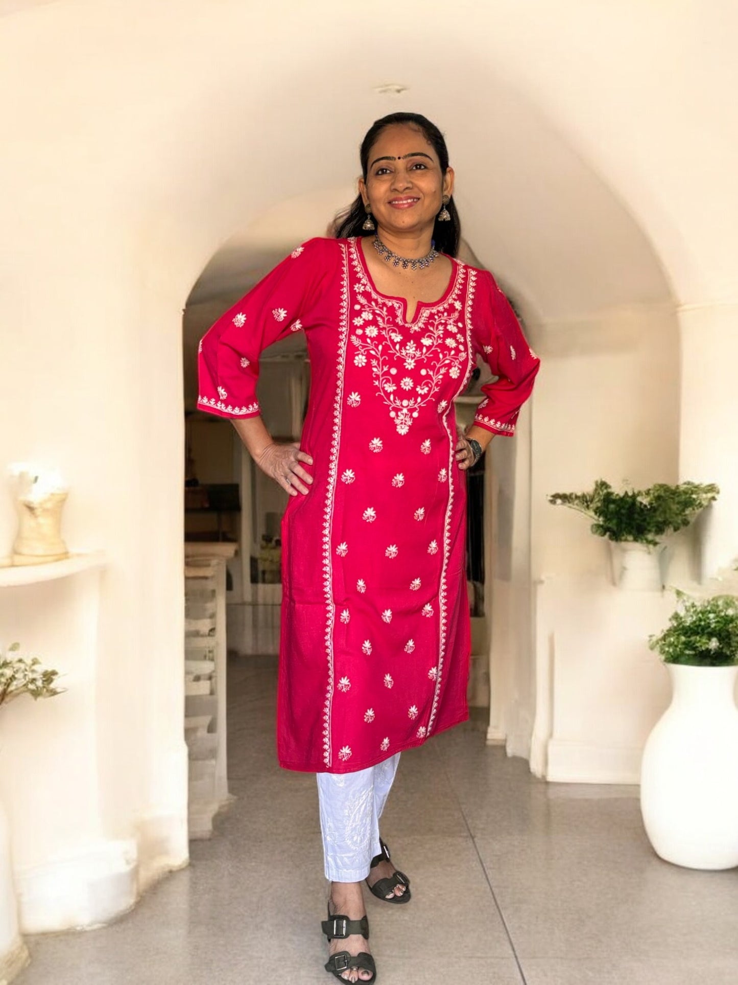 The Exclusive Magenta Pink Chikankari Handcrafted Kurti showcases delicate chikankari embroidery and vibrant color, offering a stylish blend of tradition and elegance.